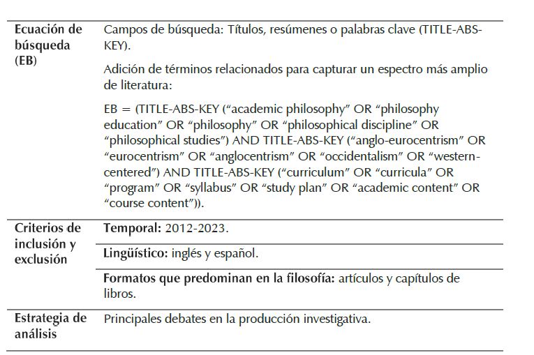 Una revisión curricular y de los planes de estudio (así sea poco exhaustiva) en el ámbito de la enseñanza de la filosofía en la educación media y superior en Colombia y Latinoamérica pone en evidencia que la cartografía filosófica trazada por Occidente, cuya mejor expresión es la adopción explícita del canon, sigue haciendo curso, es decir, se impone el eurocentrismo cultural y epistémico sobre otras tradiciones de pensamiento y/o filosofías otras (Rosero, 2021, p. 102).