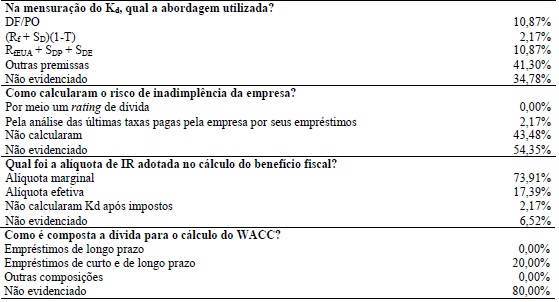 Observe-se que há uma evidenciação muito baixa das informações sobre a mensuração do custo da dívida por parte das empresas avaliadas. Na mensuração do custo da dívida, apenas 10,87% usaram a razão da despesa financeira pelo passivo oneroso (fórmula 2). Outras, 10,87% utilizaram o risco de inadimplência do país e da empresa associado à taxa livre de risco americana (fórmula 4), mas não evidenciaram como calcularam o risco de inadimplência do país e da empresa. Vale ressaltar que 41,30% usaram outros modelos que não foram os abordados nesta pesquisa, como, por exemplo, médias das taxas históricas, e 34,78% das empresas não evidenciaram a forma de mensuração utilizada, apenas apresentaram o custo da dívida.