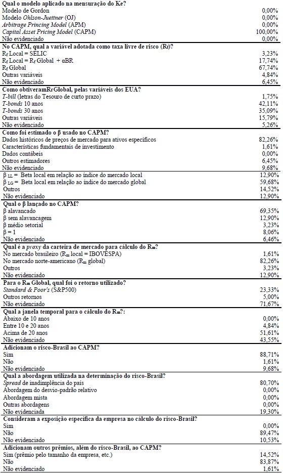 Observe-se que o modelo CAPM predomina nas avaliações, em que tem como premissa a taxa livre de risco global (EUA) em 67,74% dos laudos; desses 77,20% utilizam o T-Bonds 10 ou 30 anos. Outra evidência, é que 82,26% das avaliações usam dados históricos de preços de mercado para ativos específicos para estimar o β. O β local, em relação ao índice do mercado global, é preferência em 59,68% dessas avaliações. A maioria, 69,35% usam o β alavancado no CAPM, o que evidencia o uso da abordagem do fluxo de caixa livre, já que o APV preconiza o uso do custo sem alavancagem, em que o β é sem alavancagem (12,90%).