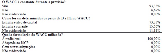 Outra observação do levantamento é que, mesmo quando as avaliações são estabelecidas na estrutura corrente e não pela estrutura-alvo, ainda usam o WACC constante, visto que apenas 6,67% dos laudos apresentaram o WACC variando com a estrutura corrente que foi encontrada em 15,56%, o que vai de encontro ao preconizado por Arditti e Levy (1977); Damodaran (2006) e Fernández (2002).
