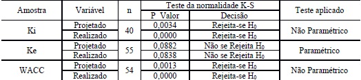 Inicialmente, a Tabela 4 apresenta o teste de verificação de normalidade de distribuição de dados das amostras; para isso foi aplicado o teste de K-S (n > 30), com nível de significância de 1% e, ainda, apresenta o teste aplicado.
