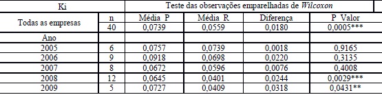 Para a amostra de todas as empresas, na média, o custo de capital de terceiros (Ki) projetado foi de 7,39% e a média realizada pelas empresas foi de 5,59%; a diferença das médias de 1,8% teve significância estatística, o que levou à rejeição da hipótese de igualdade das médias, corroborado pelo p_valor de 0,0005. Desse resultado, infere-se que, nas médias, as empresas tenderam a superavaliar o Ki.
