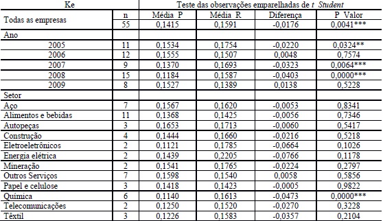 Ao longo dos anos analisados, pode ser observado que a um α = 1%, 2007 e 2008, rejeita a hipótese de igualdade das médias. Entretanto, a um α = 5%, 2005, também não apresenta aderência entre as médias. Esses períodos apresentam uma subavaliação da taxa de desconto projetada em relação a realizada. Os anos de 2006 e 2009 apresentaram igualdade nas médias a α= 1%, 5% e 10%, devido a não rejeição da hipótese nula, o que denota uma aderência nas projeções de Ke, para OPAs nesses períodos.