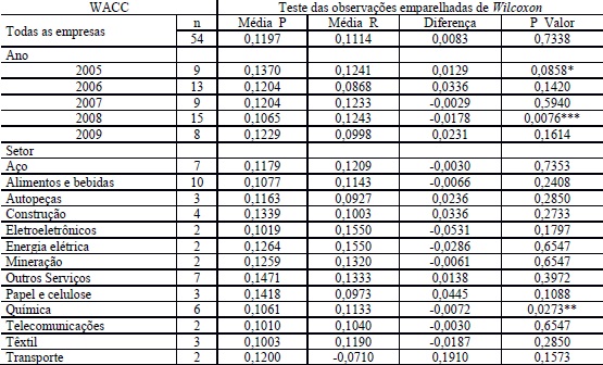 Nota-se pelos resultados apresentados que as empresas foram aderentes ao realizado nas projeções do WACC para as OPAs analisadas (p_valor = 0,7338), denotando a não rejeição da hipótese nula de igualdade das médias projetadas (11,97%) as realizadas (11,14%).