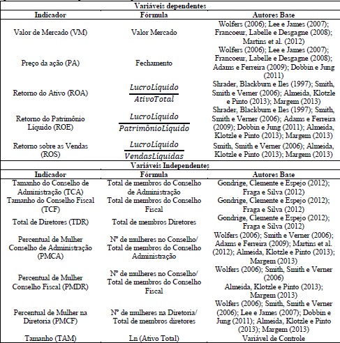Para composição das variáveis, os dados foram coletados a partir do Formulário de Referência do ano de 2014 e do banco de dados da Economática®. Após, foram tabulados em planilhas eletrônicas para cálculo das variáveis estudadas. As variáveis dependentes e independentes utilizadas nesta pesquisa estão apresentadas no Quadro 1.
