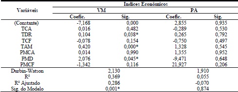 Posteriormente à análise da estatística descritiva, tem-se a regressão linear múltipla que visou identificar a influência da presença feminina nos cargos de board sobre o desempenho organizacional. Assim, primeiramente, apresenta-se a influência dos cargos de board nos índices financeiros Valor de Mercado (VM) e Preço da Ação (PA).