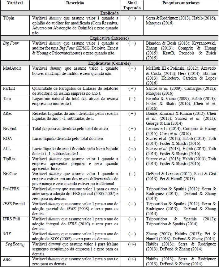 . Complementarmente, analisou-se o efeito marginal das variáveis utilizadas. Espera-se que exista uma relação negativa e significativa na probabilidade de as empresas auditadas por Big Four receberem pareceres modificados (Camargo et al., 2012). As variáveis testadas foram as apresentadas na Quadro 1 e foram testadas do modelo Logit conforme a Equação 1.