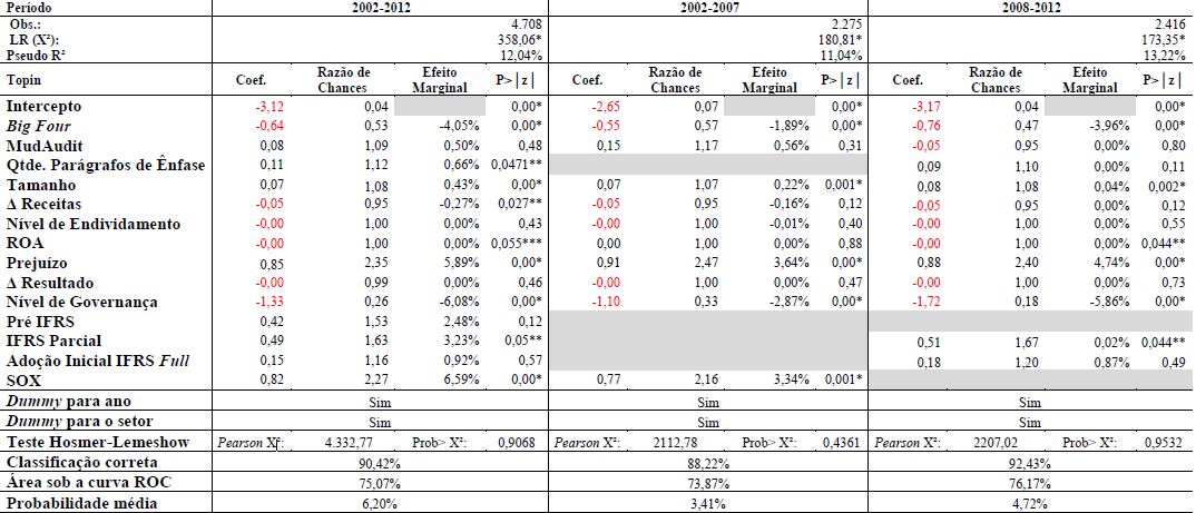 Posteriormente, considerando o objetivo geral do estudo, analisaram-se os fatores determinantes da probabilidade de chances de uma empresa participante da [B]³ receber um relatório modificado (TAB.2). Para a respectiva análise, separaram-se os dados em três períodos: um período integral (2002-2012), um período de 2002 a 2007, pré-adoção das IFRS e outro período pós-adoção das IFRS (de 2008-2012). Inicialmente, verificou-se que, em todos os modelos testados, rejeitou-se a hipótese de que todas as variáveis explicativas utilizadas eram estatisticamente iguais a zero, considerando o nível de significância de 1%. Além disso, observou-se, a partir do Pseudo R² (de McFadden), que, em média, 12% da probabilidade de se receber um parecer modificado decorre das variáveis testadas. Esse percentual aumentou para 13,22% no período pós-adoção das IFRS.