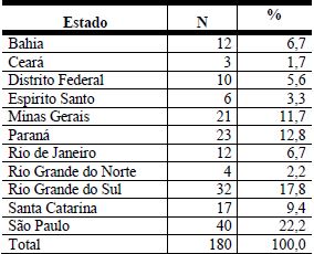 A amostra deste estudo é composta por 180 alunos que se prontificaram a responder à pesquisa e afirmaram ter tido contado com o método do estudo de caso no processo ensino- aprendizagem na pós-graduação. A Tabela 1 apresenta a distribuição dos participantes por estado no qual o PPGCCs está localizado.
