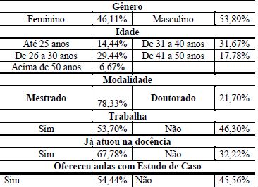 Observa-se que, do total de respondentes, 53,89% são homens, 31,7% têm idade entre 31 e 40 anos, a grande maioria dos participantes está cursando programas de mestrado (78,3%), 53,7 % estão trabalhando e 67,78 % afirmaram já terem atuado no ensino. Embora esta pesquisa tenha como amostra os discentes que afirmaram terem tido experiência com o método do estudo de caso durante as aulas na pós-graduação em Ciências Contábeis, foi perguntando, de forma complementar, àqueles discentes que já atuaram na docência se eles, em algum momento, aplicaram o método do estudo de caso em suas aulas. Constatou-se que pouco mais da metade dos respondentes (54,44%) declarou já ter tido experiência com a aplicação do método na condição de docente. Importante ressaltar que 53% dos alunos da Pós-Graduação em Contabilidade estão trabalhando, ou seja, estão conciliando a dedicação ao curso com a atuação no mercado.