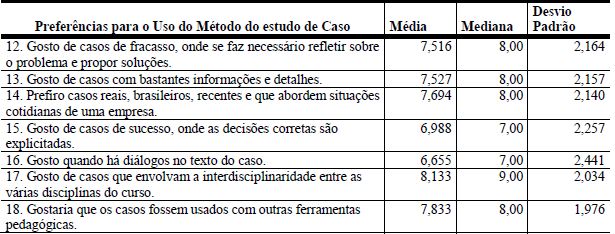 Algumas assertivas do questionário objetivaram avaliar, segundo a percepção dos alunos, as preferências pelos tipos de estudo de caso utilizados como estratégia de ensino nos programas de pós-graduação. Para mensurar o comportamento das respostas, foram utilizadas as medidas convencionais de estatística descritiva, conforme apresentado na Tabela 3.