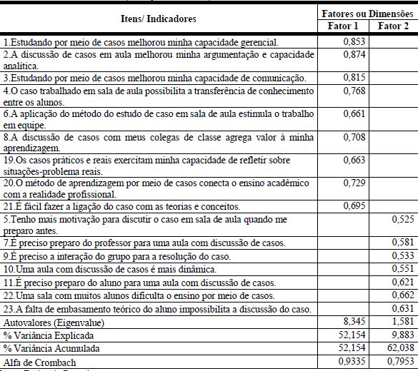 Por meio da análise fatorial exploratória aplicada no estudo, foram identificados dois fatores, os quais explicam 62,03% da variação total dos dados. O Fator 1, denominado “Habilidades e Competências Adquiridas com o Método do Estudo de Caso”, é composto de variáveis que, do ponto de vista do participante, evidenciam o enriquecimento de seu aprendizado ou do aprendizado coletivo, agregando capacidades analíticas. Já o Fator 2, denominado “Requisitos para Aplicação do Método do Estudo Caso em Sala de Aula”, agrupou assertivas relacionadas à aplicação dessa metodologia como ferramenta no processo ensino-aprendizagem dos alunos de pós-graduação.