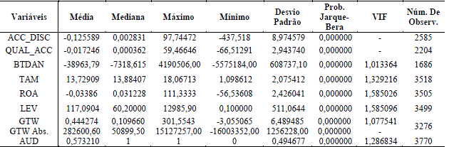 Em relação às métricas de gerenciamento de resultados, notou-se que os accruals discricionários são, em média, mais negativos, com o escore de 0,125589. No entanto, no período da amostra a frequência de valores positivos de accruals discricionários é maior, com 51,45%. A média negativa pode ser explicada pelos montantes mais altos negativos da variável ACC_DISC. Ressalta-se ainda que essa variável apresentou alto desvio padrão (8,974579) e a distribuição dos dados não é normal. Em resumo, pode-se argumentar que, mesmo com a média negativa, os accruals discricionários dessa amostra são utilizados tanto para melhorar os resultados, como para piorá-los (MARTINEZ, 2008).