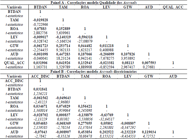 Nas variáveis de controle, observou-se que empresas maiores possuem mais accruals discricionários. Já as firmas mais rentáveis, endividadas e com tendências ao crescimento apresentam associações negativas com os accruals discricionários.