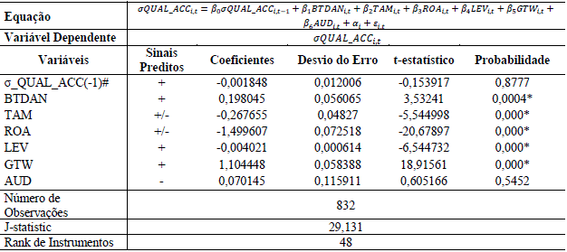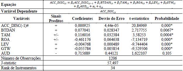 Os resultados evidenciaram a adequabilidade das estimações com o J-statistic inferior a 135,80 e seu p-value de 0,668095, o que indicam a aceitação da hipótese nula de instrumentos válidos. A limitação do modelo com dados em painel estático nos pressupostos da regressão, a endogeneidade observada nas relações BTD e accruals (TANG, 2015; PIQUEIRAS, 2010) e a ausência de autocorrelação de segunda ordem, aceitação de H0 à 0,3289, evidenciaram a consistência dos dados em painel dinâmico. Com isso, foi possível perceber a significância de diversas variáveis independentes nesse modelo.