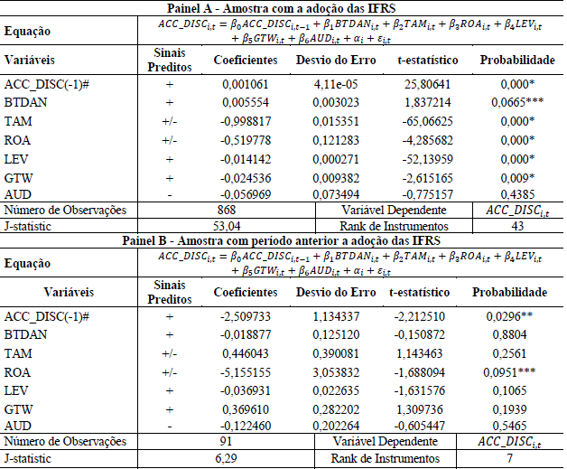 Este estudo também operacionalizou esta relação nos períodos anteriores e posteriores à adoção das IFRS, com os resultados mostrados na Tabela 4. Com as estimações para os dois períodos com GMM, os resultados foram consistentes. Para o período posterior à adoção das IFRS, verificou-se que as BTD Anormais possuem associação positiva e significativa com os accruals discricionários, conforme o esperado.