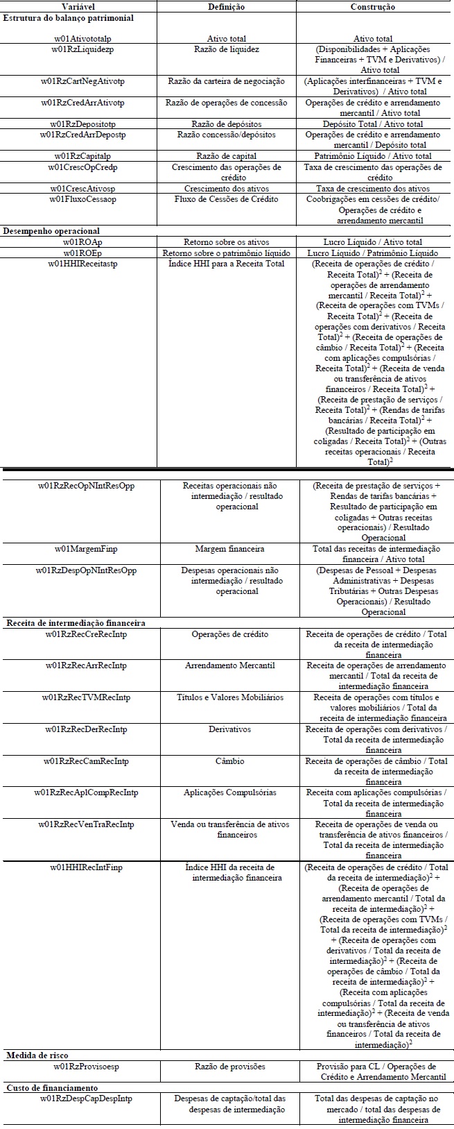Ao total, foram apuradas 25 variáveis, conforme disposto na Tabela 2. O primeiro grupo, Estrutura do Balanço Patrimonial, é constituído por 9 (nove) índices. O segundo grupo, Desempenho Operacional, e o terceiro, Receitas de Intermediação Financeira, são compostos por 6 (seis) e 7 (sete) índices, respectivamente. Por fim, os grupos Medida de Risco e Custos de Financiamento agregam uma variável cada.
