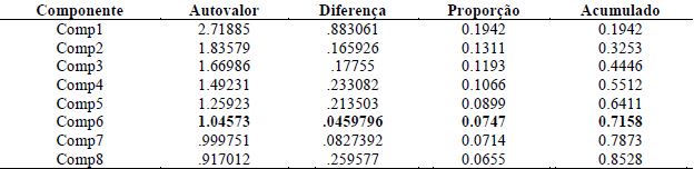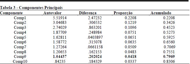 Após análise inicial dos componentes principais da amostra, optou-se pela retenção dos primeiros nove fatores para prosseguimento do estudo, em consonância com o critério de Kaiser, o qual define, como critério de corte, a manutenção dos fatores cujos autovalores (ou raízes latentes) sejam maiores ou iguais a 1,0. Apesar de se tratar de um critério arbitrário para determinação da significância dos autovalores, verificou-se, adicionalmente, que, mantidos apenas os nove primeiros fatores, já se faria possível explicar, aproximadamente, 80% da variância das variáveis, conforme Tabela 3.