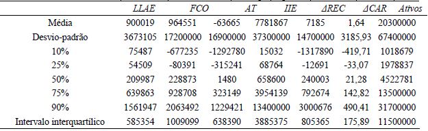 Como é possível observar, na tabela 1, as médias de todas as variáveis relatadas são heterogêneas, uma vez que estão em níveis distintos e, portanto, não são passíveis de comparação em primeira análise. O desvio-padrão de todas as variáveis é elevado, ou seja, um indicativo de grande dispersão dos dados que torna a amostra heterogênea e sugestiva de apresentar o problema de heterocedasticidade. Os percentis demonstram entre si uma alta variabilidade, o que foi observado no desvio-padrão, sendo assim o intervalo interquartílico, que é a diferença entre o quartil 75% pelo quartil 25%, representou valores em níveis distintos tanto da média como do desvio-padrão.