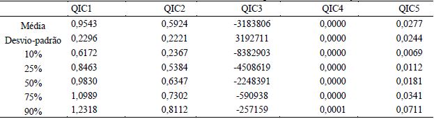 De acordo com essas informações apresentadas na tabela 1 e, acrescentando o que é exposto na tabela 2, é perceptível que, as principais variáveis e algumas medidas de qualidade da informação contábil (por exemplo, QIC2, QIC3 e QIC5) são assimetricamente distribuídas, além de possuírem valores extremos em seus percentis. Ressalta-se que foram realizados os testes de heterocedasticidade e autocorrelação no processo de estimação das métricas e, em seguida, foram feitas as correções devidas para controlar os problemas estatísticos. Resultados semelhantes foram relatados por Perotti e Wagenhofer (2014) e, com isso, ele utilizou a formação de portfólios para mitigar os efeitos dos outliers. Seguindo essa linha, esta pesquisa fez o mesmo procedimento, formando portfólios por quartis.