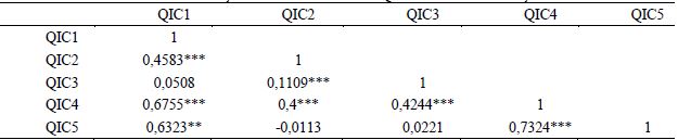 As correlações apontadas no trabalho de Perotti e Wagenhofer (2014) expuseram fortes níveis para as medidas de séries temporais (QIC1 e QIC2) no valor de 0,7519, enquanto nesta pesquisa (Tabela 3) os valores foram em proporções menores (0,4583). De forma contrária, em seu trabalho, eles observaram uma correlação mais fraca entre as medidas baseadas no mercado (QIC4 e QIC5) na ordem de 0,4923, enquanto que, neste artigo, o valor foi de 0,7324.