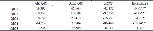 Os resultados da tabela 6 e 7 apontam, em valores absolutos, para um maior impacto da medida coeficiente resposta de resultado (QIC4) cujo AERS se relacionou, através de regressões por OLS e quantílica, mais fortemente, dada a maginitude dos coeficientes, com as outras medidas. Em segundo lugar, ficaram os accruals anormais (QIC3). As demais medidas (i.e., QIC1, QIC2 e QIC5) não apresentaram valores significativos entre si, apenas quando interagiram com as medidas referidas (i.e., QIC4 e QIC3). Vale ressaltar que esses resultados foram verificados tanto pelas estimações com OLS como por regressão quantílica na mediana e não divergiram apenas com significância na OLS para a medida de value relevance, contudo, esta medida não mostrou resultados significativos na tabela 4.