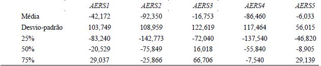 As estatísticas descritivas do spread do retorno em excesso (AERS) são apresentadas, na tabela 5, por segregação de portfólios com base na diferença das altas e baixas medidas de qualidade de informação contábil. Percebe-se uma elevada variabilidade dos dados em comparação às medidas de qualidade de resultados. Além disso, todas as medidas se demonstraram assimétricas, uma vez que exibem considerável distanciamento de valores da média em relação à mediana, o que corrobora aind amais a necessidade de utilizar a regressão quantílica na mediana que é robusta. Em todas as medidas, com exceção da value relevance (QIC5) as médias são menores do que as medianas, ou seja, as distribuições são assimétricas à esquerda, indicando maior concentração dos dados em valores mais elevados.