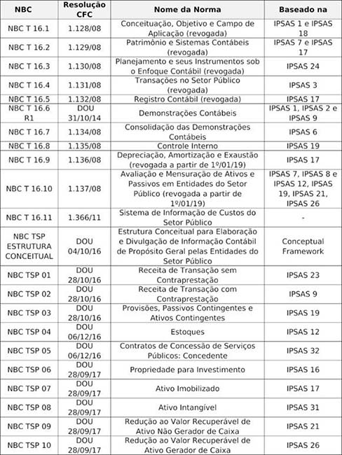 O CFC emitiu as Resoluções nº 1.128/08 a nº 1.137/08, correspondentes às NBC T 16.1 a NBC T 16.10, que tratam dos conceitos, objetivos, campo de aplicação das normas, patrimônio, planejamento, registro contábil, demonstrações contábeis, entre outros temas relevantes para o setor público. Por fim, em 2011 o CFC aprovou a NBC T 16.11 sob a Resolução CFC nº 1.366, que trata dos sistemas de informação de custos no setor público. Atualmente, as NBC T16.1 a 16.5 foram revogadas, conforme demonstrado no Quadro1, enquanto as NBC T16.9 e NBC T16.10, serão revogadas a partir de 1º/01/19.