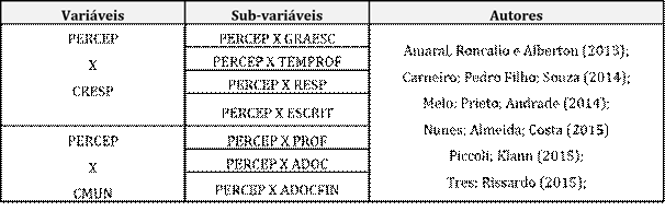 Observa-se que o cruzamento das variáveis na ANACOR ocorre entre a variável dependente PERCEP com as variáveis independentes CRESP e CMUN, com o intuito de verificar se a percepção dos contadores públicos está atrelada às características dos respondentes e dos respectivos municípios da amostra, a fim de responder à questão de pesquisa.