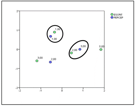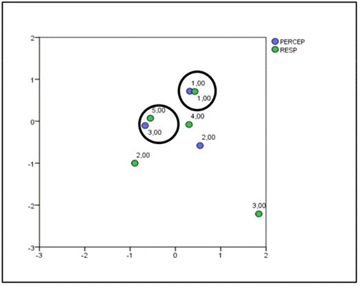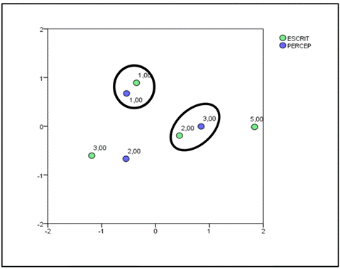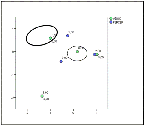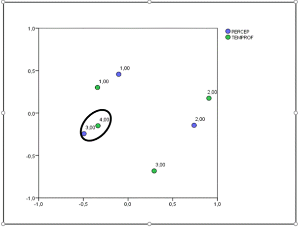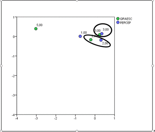 Inicialmente, abordou-se a relação entre a percepção dos contadores públicos sobre as NBC TSPs com as características dos respondentes que compõem a amostra. A Figura 2 apresenta a ANACOR entre a PERCEP e GRAESC e a Figura 3 entre PERCEP e TEMPROF.
