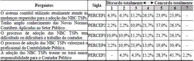 Conforme Tabela 5, 67,4% dos municípios iniciaram o processo de adoção as NBC TSPs no ano de 2014, representando 31 municípios e somente 8 municípios já finalizaram o processo de adoção. Devido à recente data da adoção, os resultados em relação à percepção do contador público sobre as novas mudanças na Contabilidade Pública e a adoção das NBC TSPs ainda podem ser conflitantes.