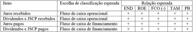 De acordo com a literatura, as relações esperadas entre essas variáveis e as escolhas contábeis que possibilitam o aumento dos fluxos de caixa operacionais são positivas, ou seja, empresas mais endividadas, mais lucrativas, maiores e com mais oportunidades de crescimento tendem a escolher classificações que aumentem os fluxos de caixa operacionais, bem como, aquelas que estão com fluxo de caixa operacional negativo. Assim, a expectativa é que empresas com essas características prefiram classificar o pagamento dos juros, dividendos e juros sobre o capital próprio nas atividades de financiamento e não nas atividades operacionais e, ainda, prefiram classificar o recebimento dos juros, dividendos e juros sobre o capital próprio nas atividades operacionais e não nas atividades de investimento. Essas relações esperadas são resumidas no Quadro 1.