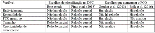Comparativamente à pesquisa realizada por Pinto et al. (2018), os resultados do presente estudo também são diferentes. Os autores mencionados tiveram como objetivo determinar os níveis de comparabilidade entre as escolhas contábeis na DFC das empresas brasileiras de capital aberto e descobrir os fatores que poderiam explicar essas escolhas. Eles encontraram relação entre: (i) o endividamento e a classificação de juros pagos e de impostos sobre o lucro; (ii) a rentabilidade e a classificação de dividendos pagos; (iii) o fluxo de caixa operacional negativo e a classificação dos juros recebidos e dos impostos sobre o lucro; (iv) o tamanho e a classificação de juros recebidos e de dividendos recebidos e pagos; e (v) as oportunidades de crescimento e a classificação de juros recebidos. Pinto et al (2018) concluíram, portanto, que há evidências de relações parciais entre todas as variáveis que pesquisaram e as escolhas contábeis na DFC. Um resumo dos resultados comparativamente aos estudos anteriores em discussão é apresentado no Quadro 2.