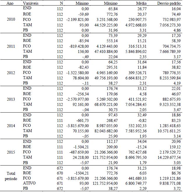 Uma visão das características das empresas da amostra no período de 2010 a 2015, pode ser obtida na Tabela 1. De acordo com as informações apuradas na Tabela 1, o endividamento das empresas foi crescente ao longo do período, ao passo que a rentabilidade foi decrescente, assim como as oportunidades de crescimento. Em 2015, em média, pouco mais de um terço do capital total à disposição das empresas correspondeu a capitais onerosos. Por sua vez, a rentabilidade das empresas do Novo Mercado, que foi, em média, de 20,4% em 2010, caiu para -15,24% em 2015. Durante a pesquisa foi possível observar que a queda na rentabilidade média da amostra foi ocasionada, notadamente, pelos altos prejuízos obtidos por algumas empresas, tais como, Renar Maçãs, Log-in e Lopes Brasil, em 2015, e Lupatech e Viver, em 2014. Não foram investigados os motivos específicos para a geração de prejuízos nessas empresas, pois não é esse o objetivo do estudo, porém, é fato que o Brasil passa por uma grave crise econômica, ainda mais severa nos últimos anos (2014, 2015), o que cria uma conjuntura ampla de dificuldades, que pode ter afetado a situação econômico-financeira das empresas.