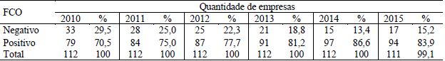 FCO = Fluxo de Caixa Operacional, sendo 1 se a empresa apresentou fluxo de caixa operacional positivo e 0, caso seja negativo, em cada ano;