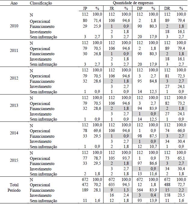 Em se tratando das escolhas de classificação do pagamento e recebimento de juros, dividendos e juros sobre o capital próprio na DFC, foram encontrados os resultados discriminados na Tabela 3.