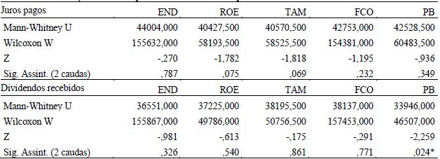 As variáveis foram submetidas ao teste de diferenças de médias de Mann-Whitney, ao nível de significância de 5%. Esse teste foi aplicado para dois grupos de empresas com distintas escolhas contábeis em relação à classificação de juros e dividendos pagos e recebidos na DFC. O intuito do teste é verificar se diferentes incentivos econômicos podem ter relação com a realização de escolhas contábeis de classificação na DFC nas empresas da amostra. As hipóteses testadas foram: H0 : não há diferenças entre os grupos; e H1 : há diferenças entre os grupos.