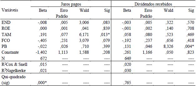 Para complementar as análises e compreender melhor a relação entre as características das empresas e as escolhas contábeis de classificação de juros pagos e dividendos recebidos na DFC, apresenta-se, na Tabela 5, a aplicação da regressão logística aos dados da pesquisa.
