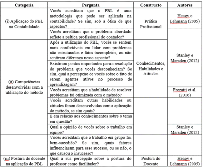 O grupo focal foi desenvolvido em três seções: (i) aplicação do PBL na Contabilidade; (ii) competências desenvolvidas com a utilização do método; e (iii) postura do docente na aplicação do PBL, sendo as questões abertas elaboradas com base nos estudos de Heagy e Lehmann (2005), Stanley e Marsden (2012) e Frezatti et al. (2016), sendo o roteiro das questões abertas evidenciado no Quadro 1.