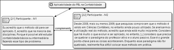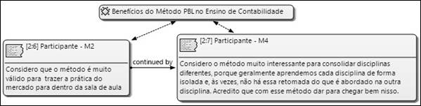 A primeira seção da entrevista em grupo focal visa identificar a percepção dos participantes da pesquisa sobre a aplicação do PBL na Contabilidade. Nessa perspectiva, verifica-se que a participante M1 considera que o método pode ser aplicável a diversas disciplinas do curso de Ciências Contábeis, confirmando, assim, a perspectiva de Manaf, Ishak e Hussin (2011) e Araújo e Slomski (2013). No entanto, apesar da aplicabilidade do PBL propiciar resultados satisfatórios quando comparado à metodologia tradicional de ensino, o respondente M2 evidencia que o método ainda é pouco utilizado, corroborando, assim, com Stanley e Marden (2012) e Martins e Espejo (2015), que afirmam que o PBL ainda é uma abordagem incipiente no ensino da Contabilidade.