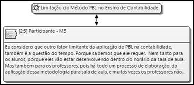 Levando em consideração que o PBL ainda não é utilizado amplamente no curso de Ciências Contábeis, a participante M3 descreve que, além da necessidade de quebrar o paradigma do docente como detentor do conhecimento e alunos como receptores de informação, também tem-se como aspecto limitante o escasso tempo dos professores para planejamento das atividades, conforme evidenciado na Figura 2.