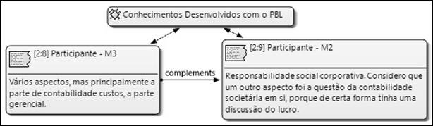 De forma complementar, a discente M3 considera que além do trabalho em equipe, levando em consideração que todos os membros atuam conjuntamente para contribuir para o sucesso da aprendizagem, também foram desenvolvidas as habilidades de estudo independente e trabalho autorregulado, tendo em vista que os discentes aprendem a aprender, sendo responsáveis pela sua própria aquisição do conhecimento. Este resultado está de acordo com as pesquisas de Ribeiro (2010), Martins, Espejo e Frezatti (2015) e Frezatti et al. (2016), que identificaram que, através do PBL, os discentes desenvolveram as habilidades de estudo independente e trabalho autorregulado.