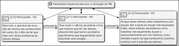 No tocante às habilidades, percebe-se que, sob a ótica da discente M5, a utilização do PBL proporcionou o desenvolvimento de habilidades de solução de problemas de ordem prática e profissional, corroborando, assim, com outros estudos já realizados na área (FREZATTI et al., 2016; MARTINS; ESPEJO; FREZATTI, 2015; RIBEIRO, 2010; SOCKALINGAM, 2010).