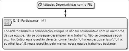 Em relação às atitudes, a participante M1 descreve que os aspectos de colaboração/cooperação, que consiste em contribuir para os objetivos do grupo, foram desenvolvidos com a aplicação do PBL, estando, assim, de acordo com as pesquisas de Hansen (2006), Savery (2006), Martins, Espejo e Frezatti (2015) e Frezatti et al. (2016). Nessa perspectiva, Martins, Espejo e Frezatti (2015) elencam a importância de se verificar os estilos de aprendizagem dos alunos, como forma de possibilitar uma melhor adaptação dos alunos no ambiente de aprendizagem colaborativa.
