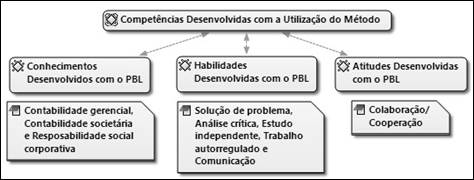 Em relação às competências desenvolvidas pelo método, observou-se que os principais conhecimentos desenvolvidos com a utilização do problema proposto foram nas áreas de Contabilidade Gerencial, Contabilidade Societária e Responsabilidade Social Corporativa. Em relação às habilidades, destacaram-se a solução de problemas, análise crítica, estudo independente, trabalho autorregulado e comunicação e, por fim, no tocante às atitudes, a colaboração/cooperação foi descrita, na entrevista em grupo focal, como desenvolvida na utilização do método.