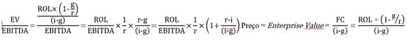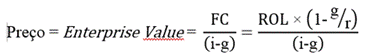 Em que FC é o fluxo de caixa da empresa, ROL é o resultado operacional líquido, g é a taxa de crescimento na perpetuidade, r é a rentabilidade (ROIC) e i é o custo de capital (WACC).