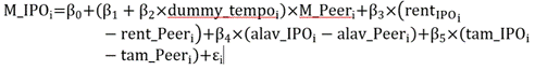 Em que, M_IPOi é o múltiplo da empresa i abrindo o capital, M_Peeri é o múltiplo das empresas listadas do setor da empresa i abrindo o capital (calculado por três alternativas: média, mediana e média harmônica), rent_IPOi é a rentabilidade da empresa i abrindo o capital, rent_Peeri é a rentabilidade das empresas listadas do setor da empresa i abrindo o capital (calculado por três alternativas: média, mediana e média harmônica), alav_IPOi é a alavancagem da empresa i abrindo o capital, alav_Peeri é a alavancagem das empresas listadas do setor da empresa i abrindo o capital (calculado por três alternativas: média, mediana e média harmônica), tam_IPOi é o tamanho da empresa i abrindo o capital, tam_Peeri é o tamanho das empresas listadas do setor da empresa i abrindo o capital (calculado por três alternativas: média, mediana e média harmônica), dummy_tempo é a variável dummy indicando o ano da abertura de capital, e Ɛi é o termo de erro.