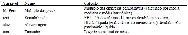 Além do múltiplo das peers, outras variáveis também foram utilizadas para explicar o múltiplo da empresa abrindo o capital. As variáveis utilizadas são as consideradas, por alguns autores (WILCOX, 1984; BHOJRAJ; LEE, 2002; SERRA; SAITO, 2015), como sendo as variáveis determinantes dos múltiplos ou de valor (seção 2.3). Neste trabalho utilizou-se: rentabilidade (medido por EBITDA/ativo), alavancagem (como proxy do risco, uma vez que a empresa abrindo o capital não possui beta, medido por dívida/patrimônio líquido) e tamanho (medido pelo logaritmo natural do ativo).