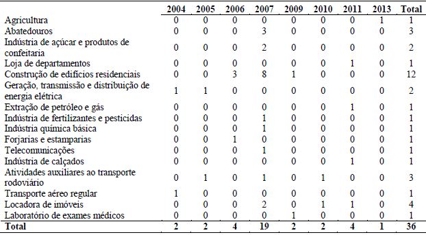 A Tabela 2 apresenta a quantidade de IPO’s por ano e por setor, já excluídos os anos em que nenhum IPO foi analisado (não compôs a amostra). Verifica-se grande concentração de IPO’s em 2007, ano com grande liquidez no mercado de capitais internacional. O setor que apresentou maior número de IPO’s foi o setor de construção de edifícios residenciais (incorporadoras), representando uma parcela considerável de todos os IPO’s e, em particular, em 2007.