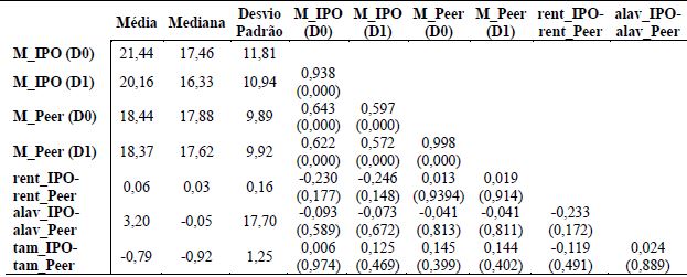 No que diz respeito às correlações, verifica-se que os múltiplos das empresas abrindo o capital têm correlação com os múltiplos de suas peers (tanto para D0 quanto para D1), porém, não têm correlação com a diferença dos drivers de valor ou proxy deles (rentabilidade, alavancagem e tamanho). Entre as diferenças dos drivers, não se verifica correlações significativas.